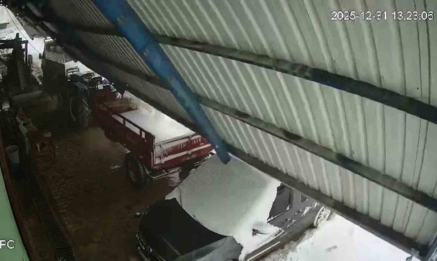 Güvenlik kamerasına yansıyan görüntülerde çatının park halindeki traktör, kamyonet ve hafif ticari aracın üzerine devrildiği görülüyor. Olayda yaralanma yaşanmadı, ancak hafif ticari aracın camı zarar gördü.