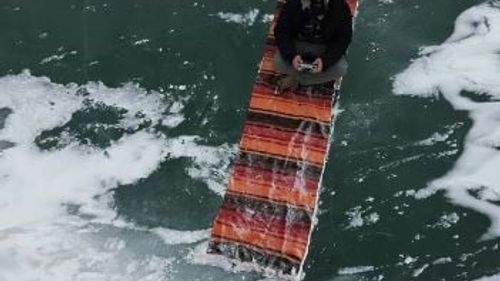 İstanbul'dan Sivas'a giden Ömer Keçiyokuşu, tamamen donan İncesu Barajı'na çıkarak kilim serip buz üzerinde oturdu ve dron ile görüntüledi.