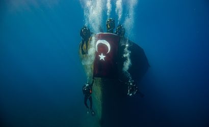5 kişilik dalış ekibi tarafından yapılan dalışta, kurbağa adamlar su altında Türk bayrağını açarak bayram coşkusunu denizin derinliklerine taşıdı.