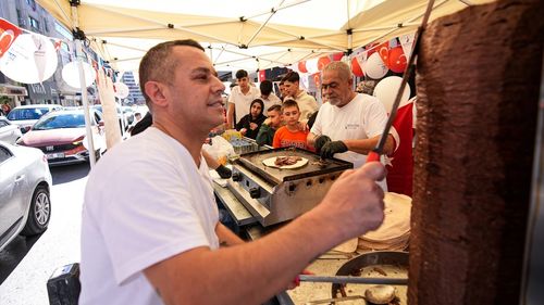 İzmir'in Konak ilçesindeki dönerci, 29 Ekim'de Halit Ziya Bulvarı'nda çocuklara ekmek arası döner ve ayran ikram ederek bayram sevincine ortak oldu.