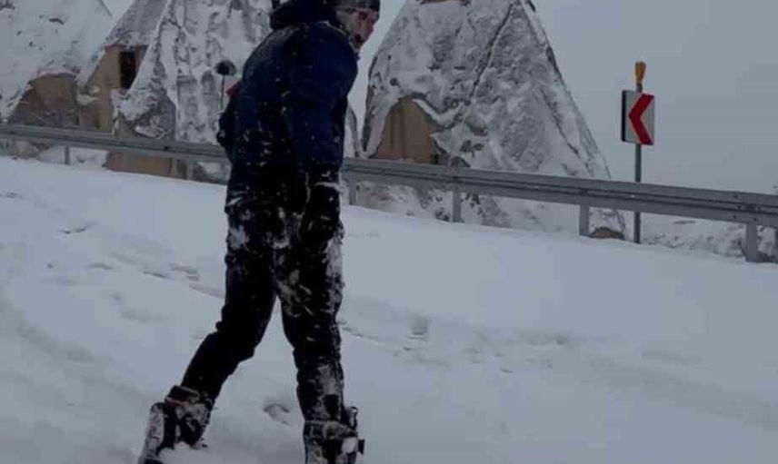 Kapadokya’yı ziyaret eden bazı vatandaşlar ise bu benzersiz manzara içinde peribacaları arasında snowboard yaparak kışın tadını çıkardı. Bölgenin her mevsim farklı güzellikler sunduğu bir kez daha gözler önüne serildi.