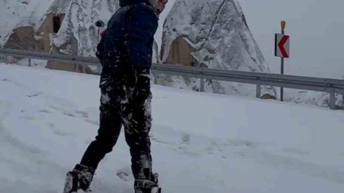 Kapadokya, yoğun karla beyaza bürünürken bazı ziyaretçiler peribacaları arasında snowboard yaparak kışın tadını çıkardı.