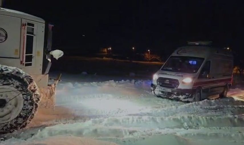 Ambulans, kar ve buzlanma nedeniyle yolda kaldı