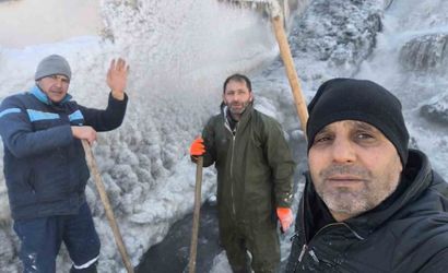 Kars Çayı üzerindeki santralde, suyun giriş kapaklarını ve iletim kanallarını tıkayan buz kütleleri işçilerin yoğun çalışmasıyla temizleniyor. Baraj hattında görev yapan ekipler, eksi 30 derece soğukta çalışırken zaman zaman soğuğa meydan okurcasına şakalaşıyor.