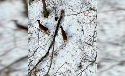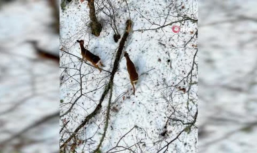 Kastamonu'nun Şenpazar ilçesinde, kar yağışı sonrası beyaz örtüyle kaplanan ormanlık alanda yiyecek arayan iki karaca, havadan drone ile görüntülendi. Görüntüler, bölgedeki yaban hayatının kış koşullarındaki mücadelesine ayna tuttu.