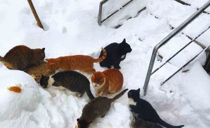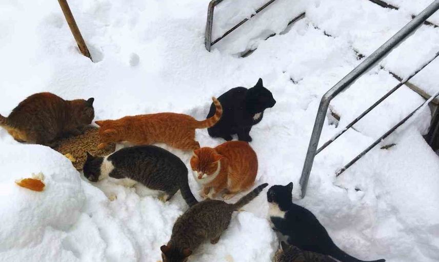 Boylarını aşan karda yürümeye çalışan kediler, imamın çağrısına cevap vermek için sıralı şekilde ilerlemeye çalıştı ve bu anlar cep telefonu kamerasına yansıdı. Görüntüler köydeki soğuk ve sevecen anların bir arada yaşandığını gösterdi.