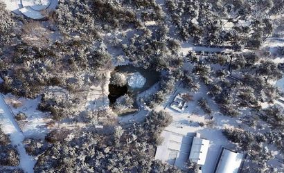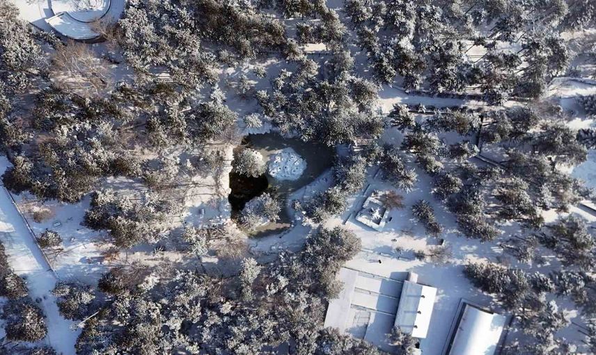 Beştepeler Mesire Alanı'nda bulunan yapay gölet soğuk havanın etkisiyle buz tuttu. Göletin üzerinde bir arada duran kaz ve ördekler, çevredeki karla kaplı yeşil ağaçların arasında görsel bir şölen sundu; alan, havadan da görüntülendi.