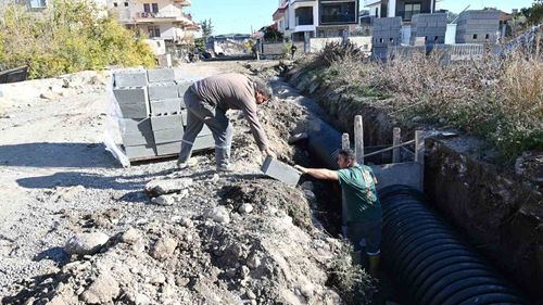 Kemer Belediyesi Fen İşleri, Kuzdere Mahallesi 38. Cadde'de 350 m imar yoluna 800’lük koruge boru ile yağmur suyu drenaj hattı döşüyor; ardından kaldırım ve parke çalışmaları yapılacak.