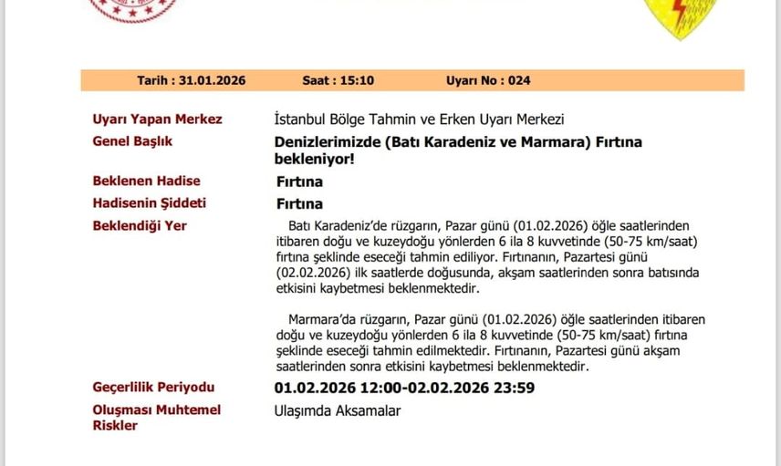 Meteoroloji ayrıca Batı Karadeniz ve Marmara Denizi için de uyarıda bulundu. Buna göre 1 Şubat Pazar gününden itibaren 2 Şubat saat 23.59'a kadar denizlerde rüzgarın doğu ve kuzeydoğu yönlerden 6 ila 8 kuvvetinde (50-75 km/saat) fırtına şeklinde esmesi bekleniyor.