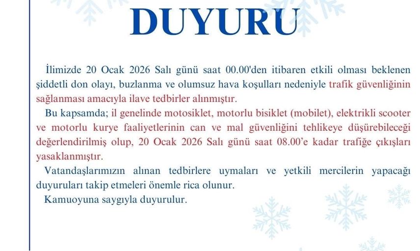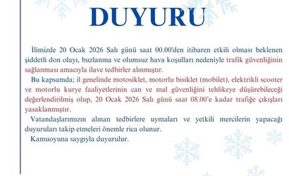 Kısıtlamanın süresi 20 Ocak sabah saat 08.00 olarak belirlendi; karar, trafik güvenliğini tehdit eden olumsuz hava koşulları gerekçesiyle alındı.
