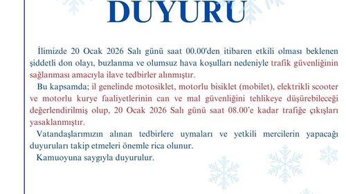 Kırşehir Valiliği, şiddetli don ve buzlanma nedeniyle motosiklet, scooter ve kurye sürücülerinin 20 Ocak sabah 08.00'e kadar trafiğe çıkışını kısıtladı.