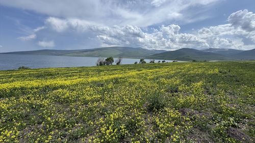 Çıldır Gölü, kışın buz tuttuğu yüzeyinin ardından baharda çiçeklerle kaplandı, yemyeşil manzaralar oluşturdu.