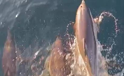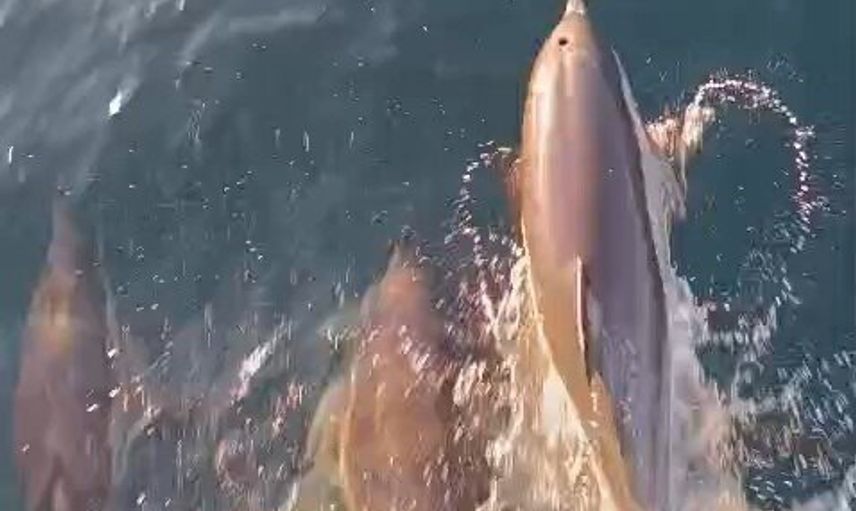 Cep telefonu kamerasıyla kaydedilen görüntülerde, yunusların su yüzeyine çıkarak ahenk içinde ilerlediği ve tekneye neşeli şekilde eşlik ettiği anlar yer aldı.