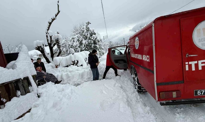 İhbar üzerine harekete geçen Kozlu Belediyesi İtfaiye Müdürlüğü ekipleri, zorlu hava koşullarına rağmen arazi aracıyla bölgeye ulaşarak hastayı evinden aldı.