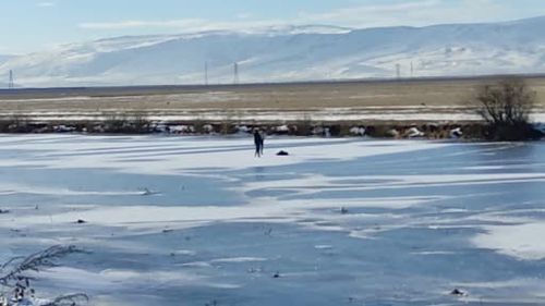 Ardahan'da yüzeyi tamamen buzla kaplanan Kura Nehri, kalınlaşan buz tabakası sayesinde vatandaşların nehir üzerinde yürüyüş yapmasına imkan sağladı.