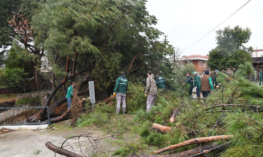 İhbarın ardından olay yerine hızla intikal eden Kuşadası Belediyesi Park ve Bahçeler Müdürlüğü ekipleri, yağışlara rağmen zamanla yarışarak çalışmalara başladı. Dereyi ve yolu tamamen kapatan çam ağacı parçalara ayrılarak kaldırıldı.