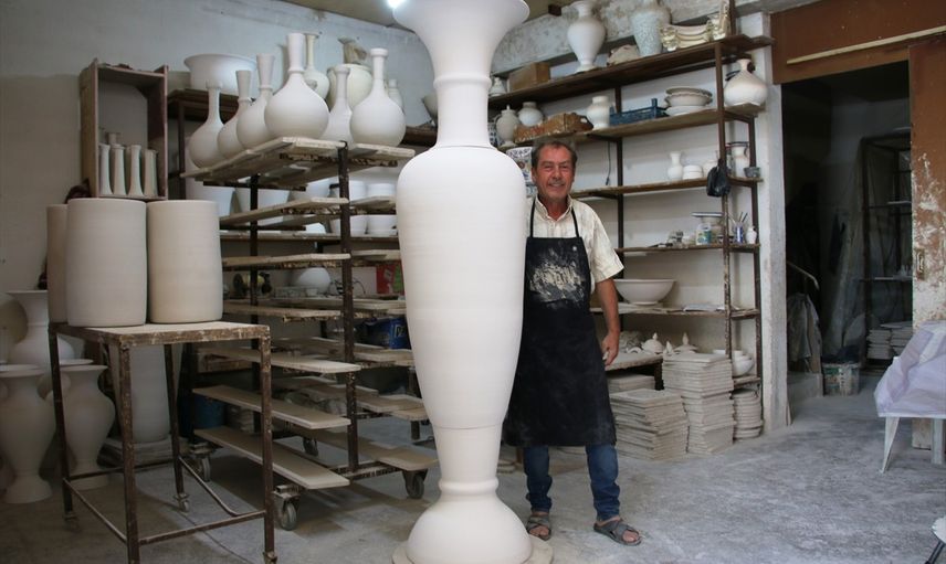 Kütahya'da çini ustası Remzi Oruç, çini çamurundan 2 metreyi aşkın uzunlukta vazo üretti.