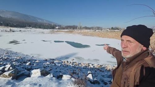 Kütahya Demirciören köyündeki sulama göleti, üç gündür süren sert soğuklarda eksi 10 ila eksi 14°C'ye inen hava nedeniyle yüzeyi tamamen buzla kaplandı; köylüler uyarıyor.