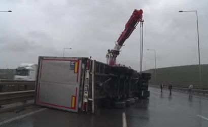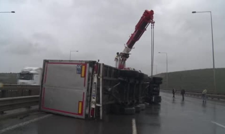Kuzey Marmara Otoyolu'nun Kocaeli kesiminde, gece saatlerinden itibaren etkili olan şiddetli fırtına nedeniyle otoyolun Dilovası ilçesi geçişinde seyir halindeki iki tır kontrolden çıkarak devrildi. Fırtına, bölgede ulaşımda aksamalara yol açtı.