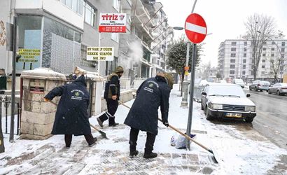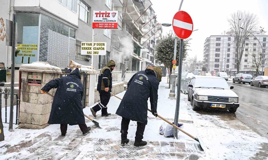 Kar yağışının yoğun olduğu bölgelerde ekipler, kar küreme ve buzlanmaya karşı önlemler alıyor; şehir merkezinde kaldırımlarda temizlik, buzlanmaya karşı solüsyonlama ve tuzlama çalışmaları aralıksız devam ediyor.
