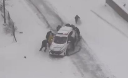 Dakikalar sonra, karla kaplı rampayı aşmakta zorlanan bir polis aracı görüldü. Bu görüntüye kayıtsız kalmayan vatandaşlar, hiç tereddüt etmeden araca yardım etti. Birlikte itilen polis aracı kısa sürede güvenli bölgeye ulaştırıldı.