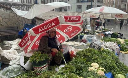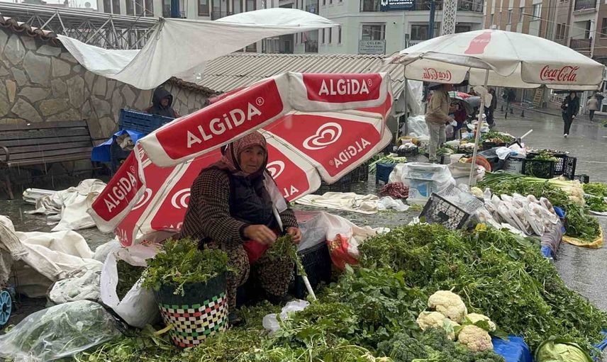 Pazarcı esnafı yağmur altında satış yapmaya çalışırken, özellikle yaşlı kadın esnafların tezgâhlarını terk etmediği görüldü. Olumsuz hava koşulları nedeniyle pazar alanı normal günlere göre daha sakin kaldı.