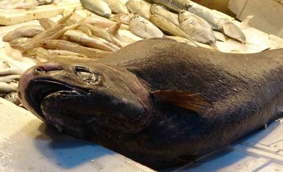 Mersin'de Akdeniz'de nadir görülen yaklaşık 1,5 metre boyunda ve 25 kilogram ağırlığındaki 'Atlas balığı' balık pazarında kısa süreliğine sergilendi.