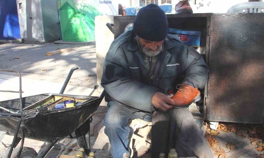 Bayram Batı (67), 32 yaşından beri ayakkabı boyacılığı yapıyor ve ekmeğini kazandığı işini yaklaşık 35 yıldır sürdürüyor. Yaz-kış demeden Karacaoğlan Çınaraltı Parkı'nda çalışan Batı, kışın soğuğuna rağmen işini bırakmıyor.