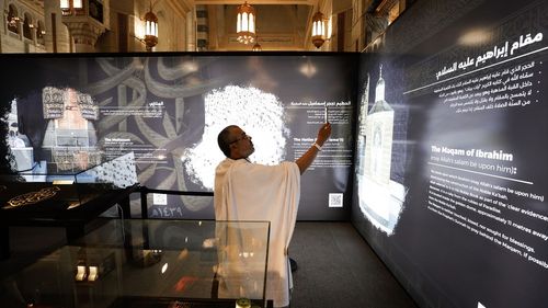 Kabe’nin inşasını merak eden hacı adayları, Mescid-i Haram’da açılan 'İlk Ev' sergisinde bilgi ediniyor.