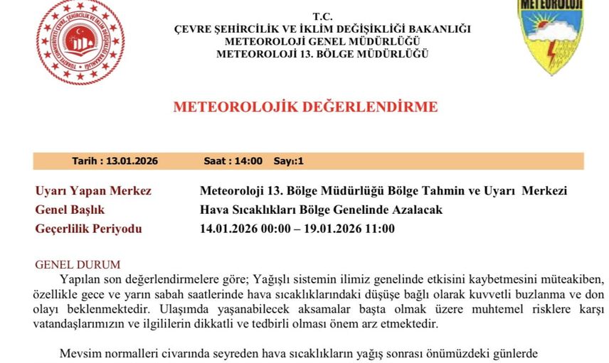 "Yapılan son değerlendirmelere göre; yağışlı sistemin ilimiz genelinde etkisini kaybetmesini müteakiben, özellikle gece ve yarın sabah saatlerinde hava sıcaklıklarındaki düşüşe bağlı olarak kuvvetli buzlanma ve don olayı beklenmektedir. Ulaşımda yaşanabilecek aksamalar başta olmak üzere muhtemel risklere karşı vatandaşlarımızın ve ilgililerin dikkatli ve tedbirli olması önem arz etmektedir. Mevsim normalleri civarında seyreden hava sıcaklıkların yağış sonrası önümüzdeki günlerde mevsim normallerinin 4 ila 7 derece altında seyretmesi beklenmektedir"