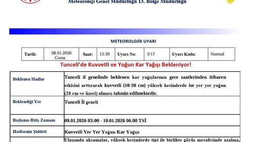 Meteoroloji 13. Bölge Müdürlüğü, Tunceli genelinde sabah saatlerinden itibaren kuvvetli (10-20 cm) ve yüksek kesimlerde yoğun (20 cm ve üzeri) kar beklendiğini açıkladı.