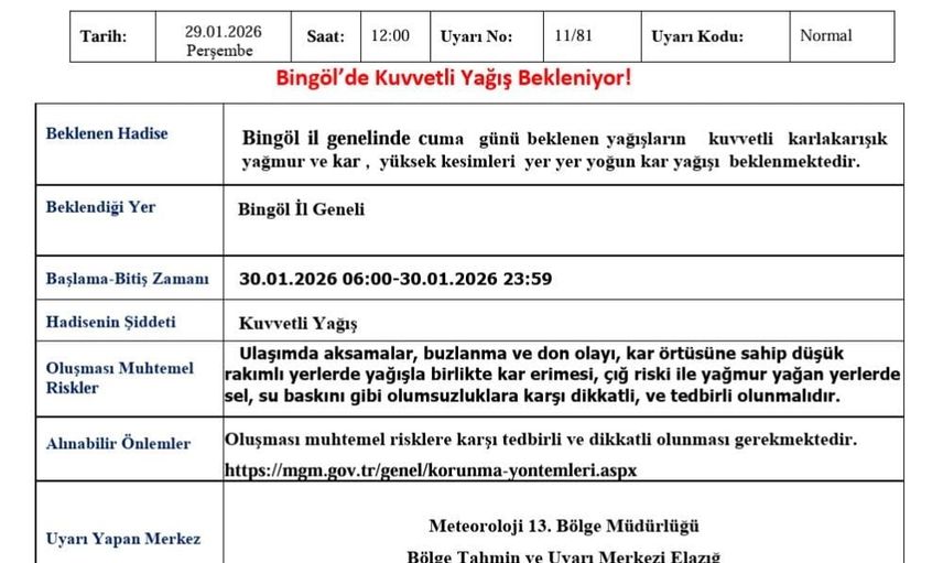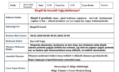 "Bingöl il genelinde cuma günü beklenen yağışların kuvvetli karla karışık yağmur ve kar, yüksek kesimleri yer yer yoğun kar yağışı beklenmektedir. Ulaşımda aksamalar, buzlanma ve don olayı, kar örtüsüne sahip düşük rakımlı yerlerde yağışla birlikte kar erimesi, çığ riski ile yağmur yağan yerlerde sel, su baskını gibi olumsuzluklara karşı dikkatli, ve tedbirli olunmalıdır" denildi.