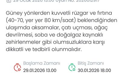 Açıklamaya göre 29 Ocak 2026 Perşembe günü saat 13.00’ten itibaren güney yönlerden esecek rüzgarın saatte 40 ila 70 kilometre hızla esmesi, bazı bölgelerde ise hızının 80 kilometreye kadar çıkması bekleniyor.