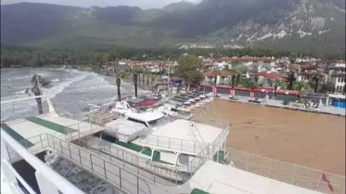 Muğla’nın Akyaka mahallesinde sağanak ve fırtına sonucu dağlardan gelen çamurlu sular denize karıştı, su kahverengiye döndü; deniz seviyesi yükseldi.