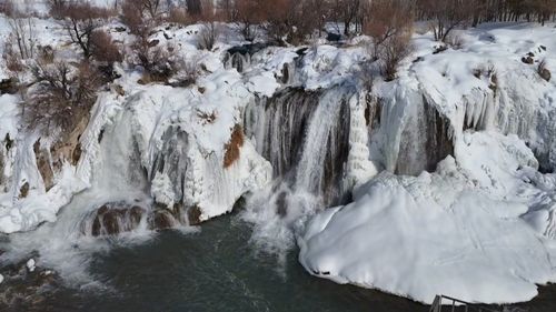 Van'daki Muradiye Şelalesi, dondurucu soğuklar nedeniyle kısmen donarak kartpostallık görüntüler oluşturdu; fotoğrafçı Recep Dağ dron ile manzarayı kaydetti.