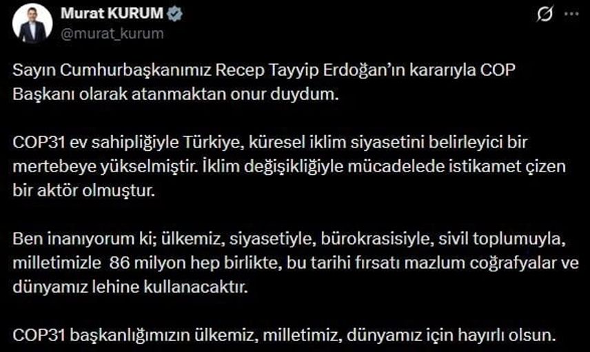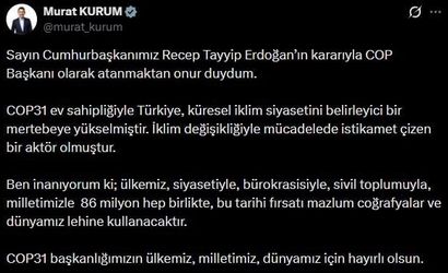 Çevre, Şehircilik ve İklim Değişikliği Bakanı Murat Kurum, Cumhurbaşkanı Recep Tayyip Erdoğan tarafından COP Başkanı olarak atanmasının ardından sosyal medya hesabından açıklama yaptı.