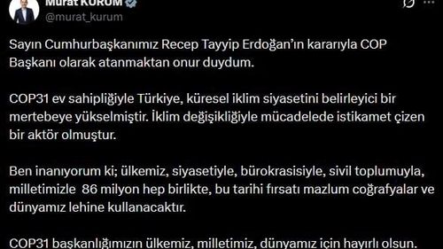 Murat Kurum COP Başkanı olarak atandıÇevre, Şehircilik ve İklim Değişikliği Bakanı Murat Kurum, Cumhurbaşkanı Recep Tayyip Erdoğan tarafından COP Başkanı olarak atanmasının ardından sosyal medya hesabından açıklama yaptı.Kurum'un açıklaması"Cumhurbaşkanımız Recep Tayyip Erdoğan’ın kararıyla COP Başkanı olarak atanmaktan onur duydum. COP31…