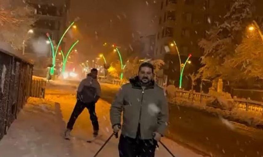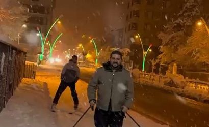 Bu fırsatı değerlendiren 3 arkadaş, kayak ekipmanlarını kuşanarak kentin en işlek noktalarından biri olan İstasyon Caddesi'nde alışılmadık bir etkinlik gerçekleştirdi. Üçlü, kaldırım üzerinde kayak yaparak çevredeki vatandaşların bakışları arasında ilerledi.