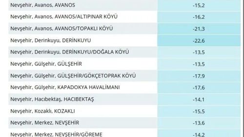 2 Ocak 2026 gecesi Nevşehir'de en düşük sıcaklık Derinkuyu'da -22,6 derece ölçüldü; yetkililer buzlanma ve don uyarısı yaptı.