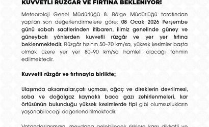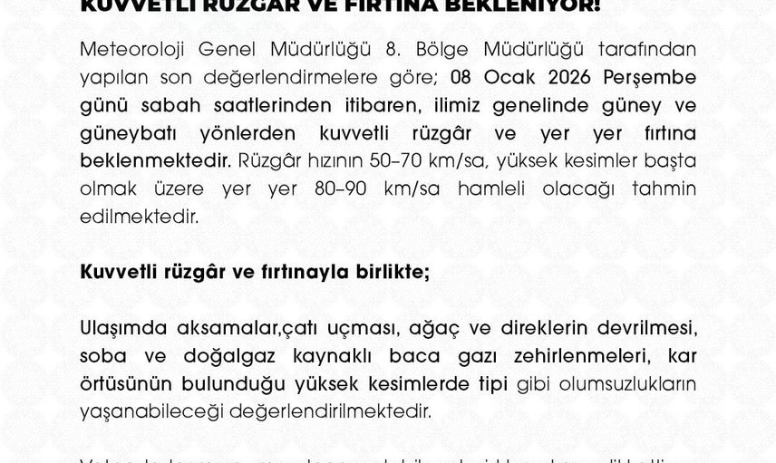 "Kuvvetli rüzgar ve fırtınayla birlikte ulaşımda aksamalar, çatı uçmaları, ağaç ve direklerin devrilmesi, soba ve doğalgaz kaynaklı baca gazı zehirlenmeleri ile kar örtüsünün bulunduğu yüksek kesimlerde tipi gibi olumsuzlukların yaşanabileceği değerlendiriliyor. Vatandaşların meydana gelebilecek risklere karşı dikkatli ve tedbirli olmaları, yetkili mercilerin uyarı ve yönlendirmelerine riayet etmeleri gerekiyor."