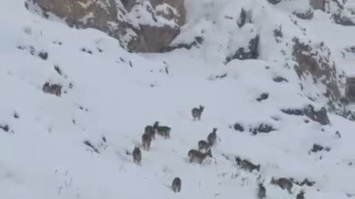 Elazığ'ın Palu Kalesi çevresinde yağan kar altında dağ keçileri sürü halinde görüntülendi; o anlar cep telefonu kamerasına yansıdı.