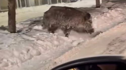 Ağrı'nın Patnos ilçesinde Selahaddin Eyyübi Mahallesi Kanuni Caddesi'nde aç kalan yaban domuzlarının şehir merkezine indiği anlar cep telefonu görüntüleriyle kaydedildi.