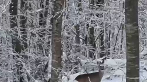 Geyve'de kar nedeniyle yiyecek bulmakta zorlanan yaban hayvanları için yem bırakan vatandaş, ormanlık alanda iki geyikle karşılaştı ve anları kaydetti.