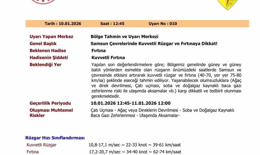 METEOROLOJİ GENEL MÜDÜRLÜĞÜ 10. BÖLGE MÜDÜRLÜĞÜ, SAMSUN VE ÇEVRELERİ İÇİN KUVVETLİ RÜZGAR VE FIRTINA UYARISINDA BULUNDU.