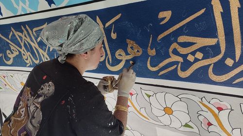 Samsunlu kadın nakkaşlar Aynur Şeker, Nazlı Cezan ve Işık Kahrıman, iskelede metrelerce yükseğe çıkarak camilerin tavan ve duvarlarını ince fırça darbeleriyle motiflerle süslüyor.