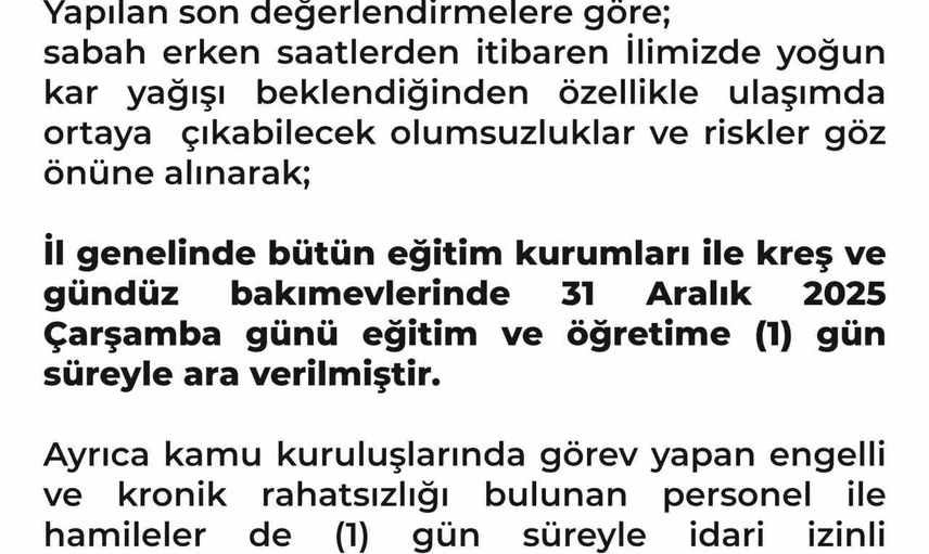 "Yapılan son değerlendirmelere göre; sabah erken saatlerden itibaren ilimizde yoğun kar yağışı beklendiğinden özellikle ulaşımda ortaya çıkabilecek olumsuzluklar ve riskler göz önüne alınarak; il genelinde bütün eğitim kurumları ile kreş ve gündüz bakım evlerinde 31 Aralık 2025 çarşamba günü eğitim ve öğretime 1 gün süreyle karar verilmiştir. Ayrıca kamu kuruluşlarında görev yapan engelli ve kronik rahatsızlığı bulunan personel ile hamileler de 1 gün süreyle idari izinli sayılacaktır"