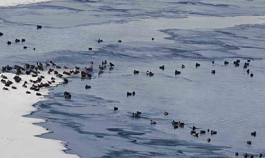 Göçmen kuşların önemli uğrak ve konaklama alanlarından biri olan HES Göleti, aşırı soğuk nedeniyle dondu. Kuşlar, gölete akan suyun oluşturduğu küçük buzsuz alanlarda yiyecek arayarak yaşamlarını sürdürmeye çalışıyor. Bu görüntüler, sert kış koşullarının yaban hayatı üzerindeki etkisini gözler önüne serdi.