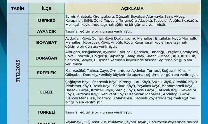Türkeli ve Ayancık ilçelerinde taşımalı eğitim öğretime bir gün süreyle ara verilirken, Merkez ilçe ile Boyabat, Erfelek, Durağan, Gerze ve Dikmen ilçelerinin bazı bölgelerinde taşımalı eğitime kısmi olarak ara verildi.