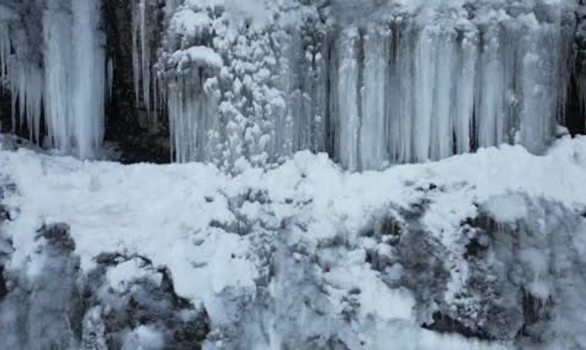 Hava sıcaklığının eksi 20 dereceyi bulmasıyla dağlardan çıkan sular buza dönüşerek metrelerce uzunluktaki buz sarkıtlarını oluşturdu. Ortaya çıkan manzara dronla görüntülendi.