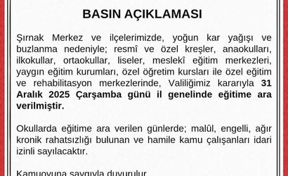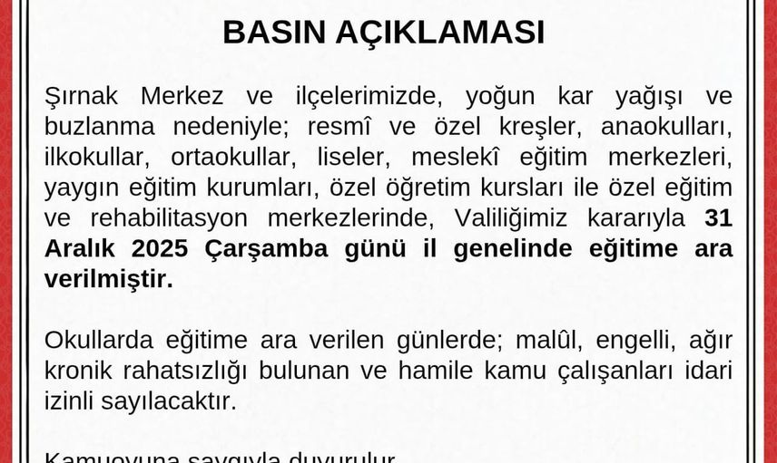 ‘’Şırnak merkez ve ilçelerimizde, yoğun kar yağışı ve buzlanma nedeniyle resmi ve özel kreşler, anaokulları, ilkokullar, ortaokullar, liseler, meslekî eğitim merkezleri, yaygın eğitim kurumları, özel öğretim kursları ile özel eğitim ve rehabilitasyon merkezlerinde, valiliğimiz kararıyla 31 Aralık 2025 Çarşamba günü il genelinde eğitime ara verilmiştir. Okullarda eğitime ara verilen günlerde malul, engelli, ağır kronik rahatsızlığı bulunan ve hamile kamu çalışanları idari izinli sayılacaktır’’ denildi.